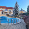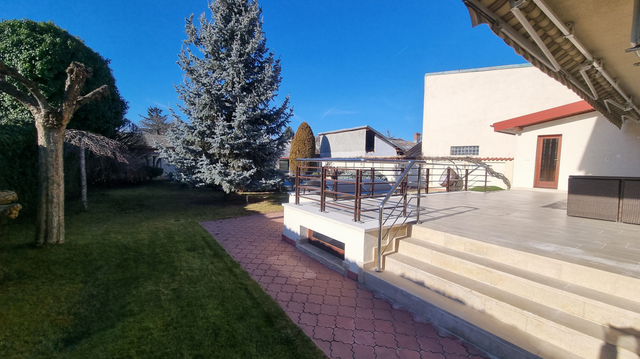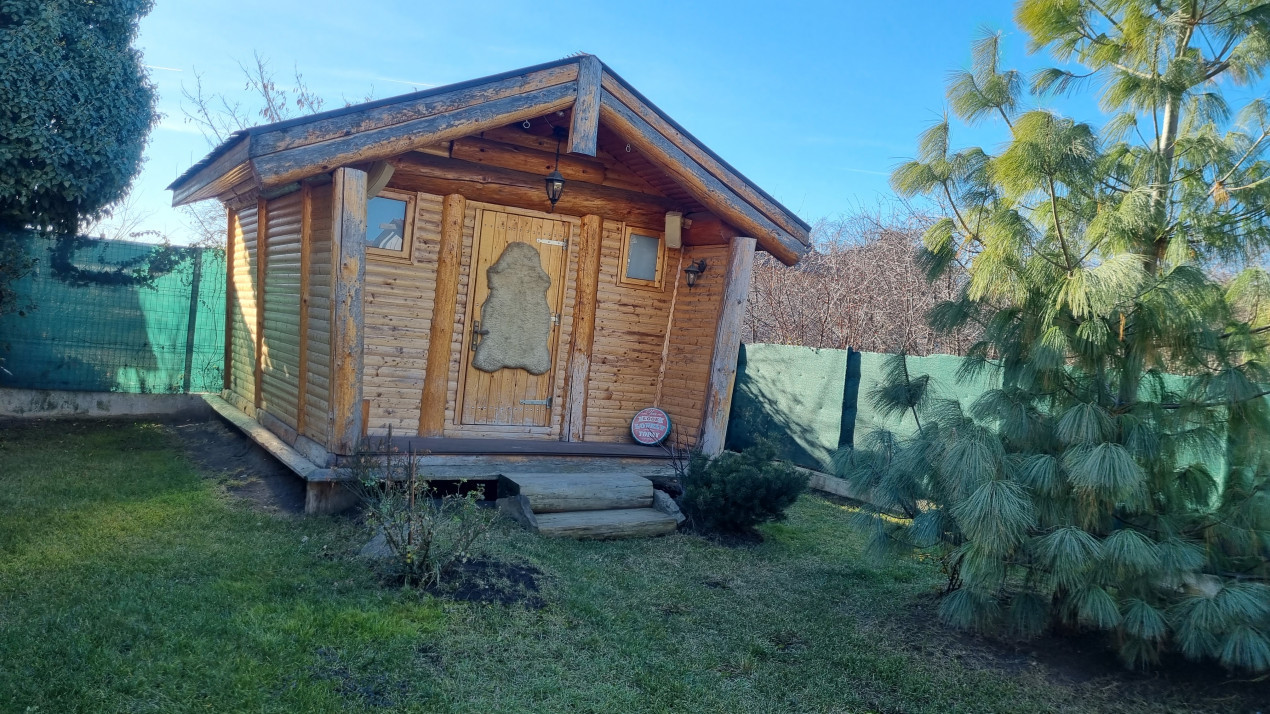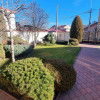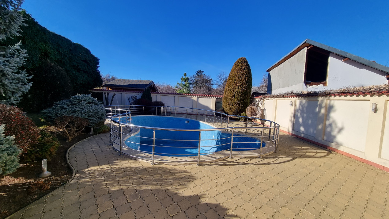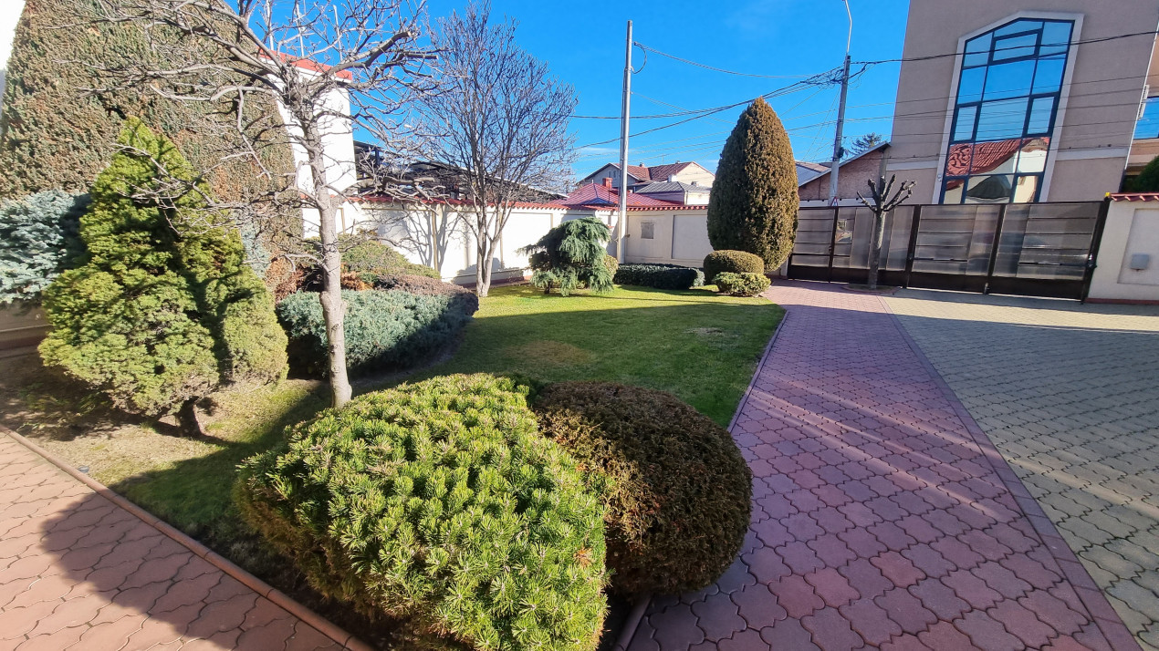 Imobilul are doua intrari fata-spate, curtea este imprejmuita cu gard din beton, este pavata cu dale si este frumos amenajata ca si gradina cu gazon, arbusti si plante ornamentale: are doua garaje si dispune de patru locuri de parcare, beci, piscina exterioara si o casuta intima din lemn in gradina.